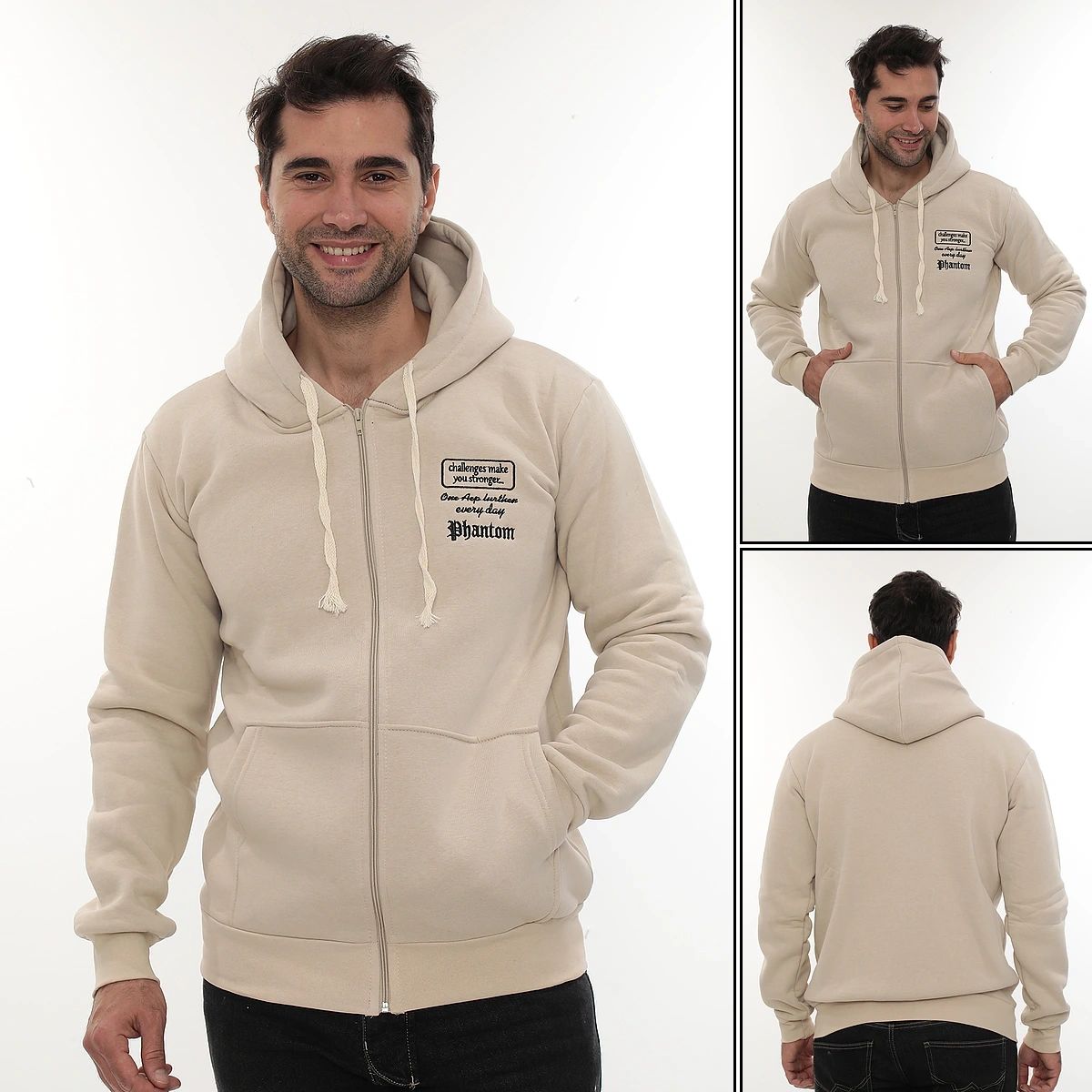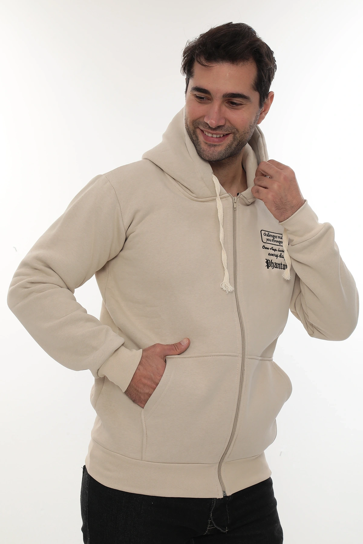 Phantom Jeans erkek bej standart fit normal kesim içi polarlı tam fermuarlı kapüşonlu pamuklu sweatshirt, rahatlığı ve şıklığı bir arada sunar.
